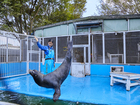 東京動物専門学校の富里キャンパスでアシカトレーニングを行う学生